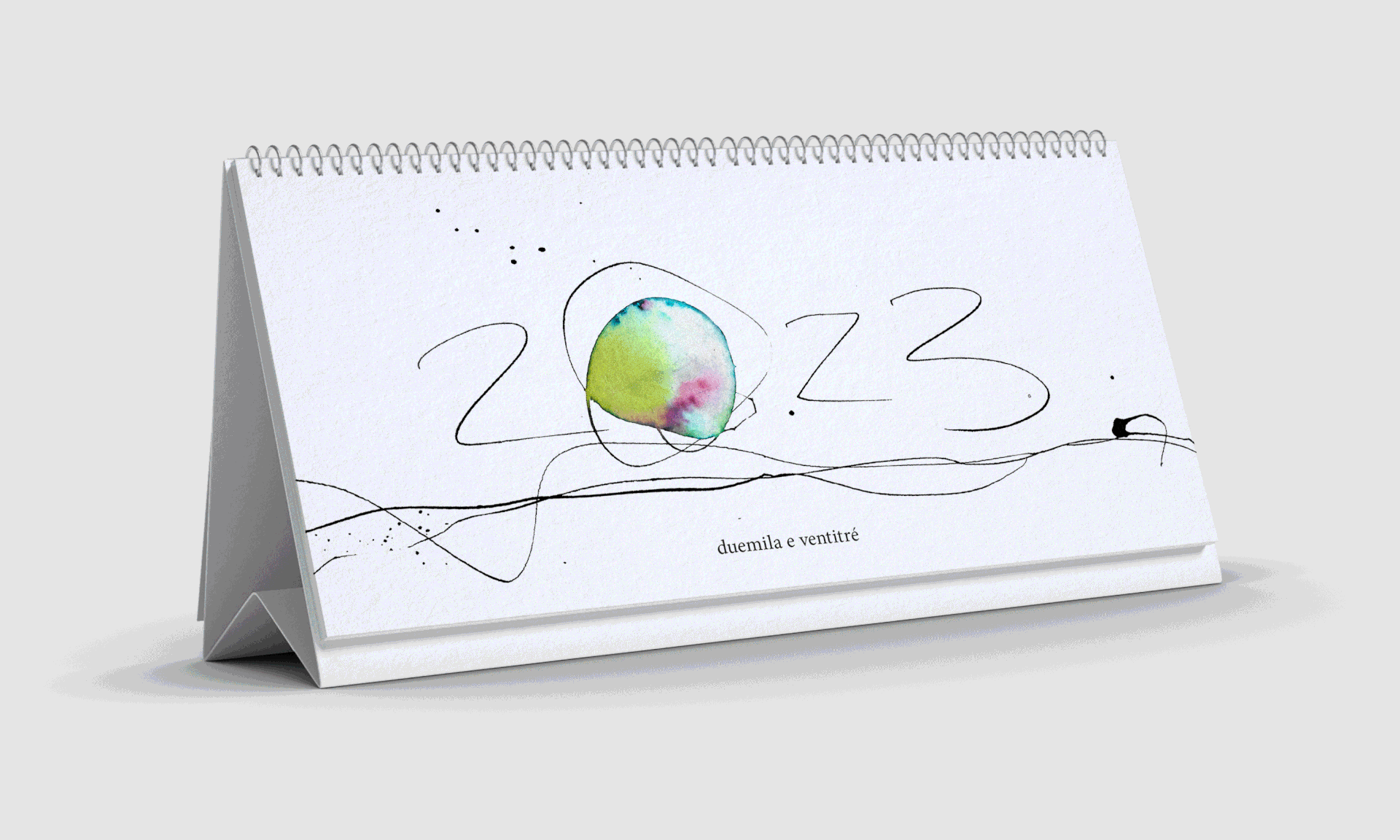 Un piccolo calendario da scrivania illustrato. Semplici acquerelli astratti si intrecciano con i numeri rincorrendo i colori delle stagioni. Per ogni mese un pensiero di poeti e scrittori. Benvenuto duemila e ventitré.